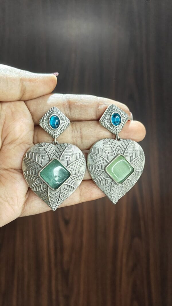 The Antique Silver Green Heart Drops showcase a bold ethnic charm with a detailed silver-tone heart base featuring intricate leaf engravings. A soft green square stone forms the centerpiece, paired with a bright blue oval stud top for a refreshing pop of color.