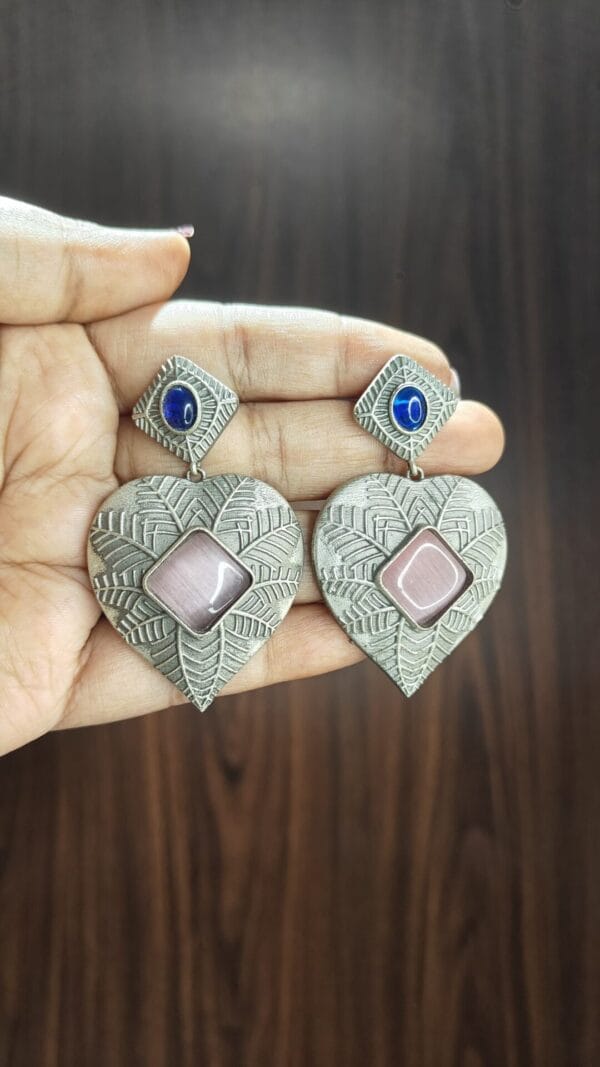 The Antique Heart Charm Drops combine rustic elegance with statement style. Featuring a textured silver-tone heart design with intricate leaf engravings, a soft mauve square stone at the center, and a contrasting blue oval stud top, these earrings are perfect for bold, ethnic-inspired looks.