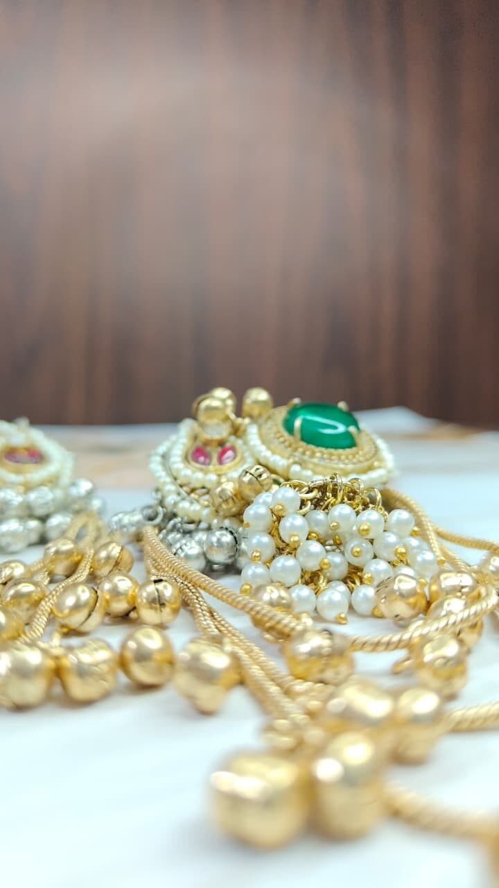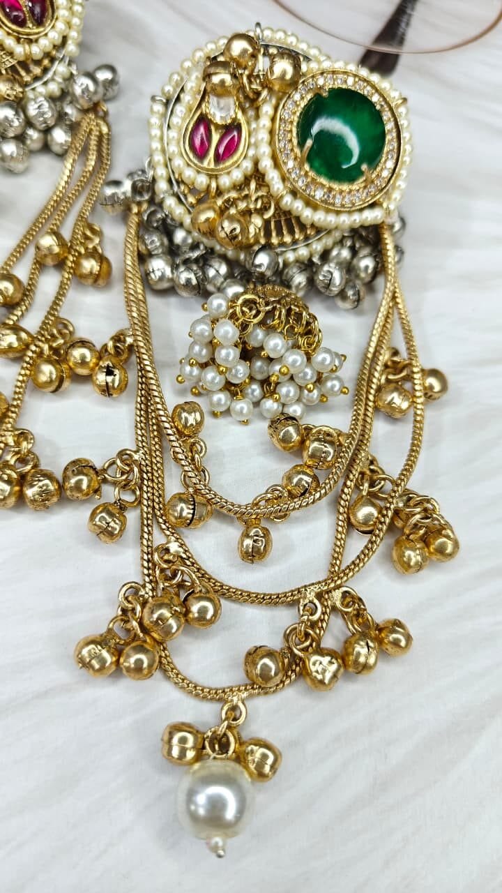 Layers of gold chains attached, ending with dainty golden ghungroos and pearls
