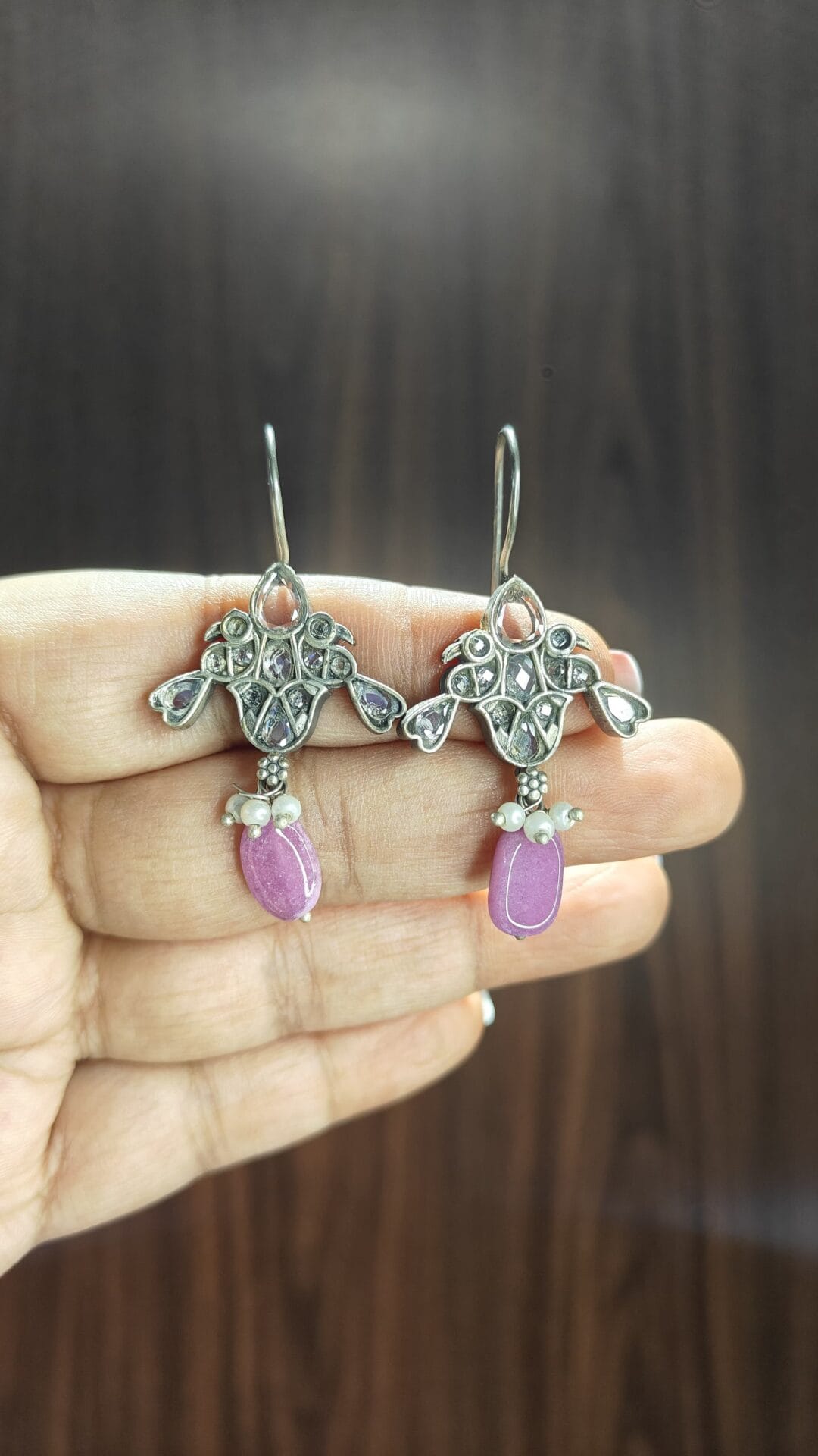 Delicate antique-finish bird-shaped drop earrings adorned with sparkling stones and accented by a smooth pink stone drop with tiny pearl detailing. A graceful accessory for a charming ethnic look.
