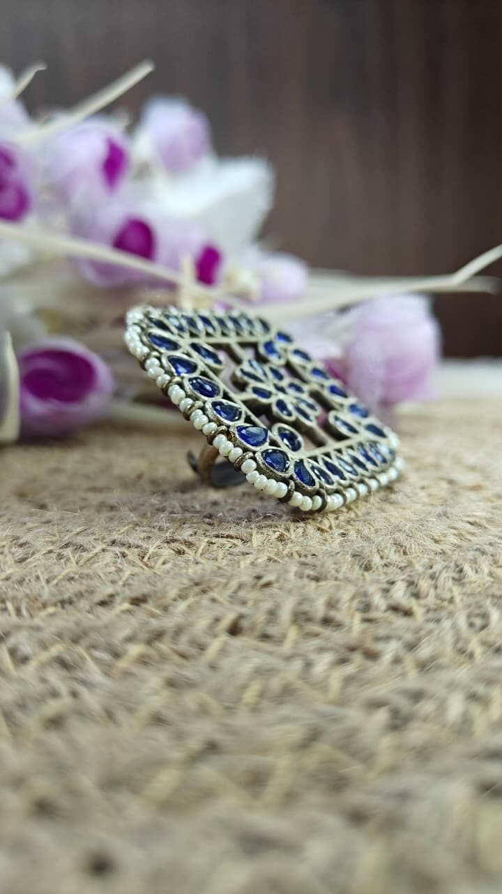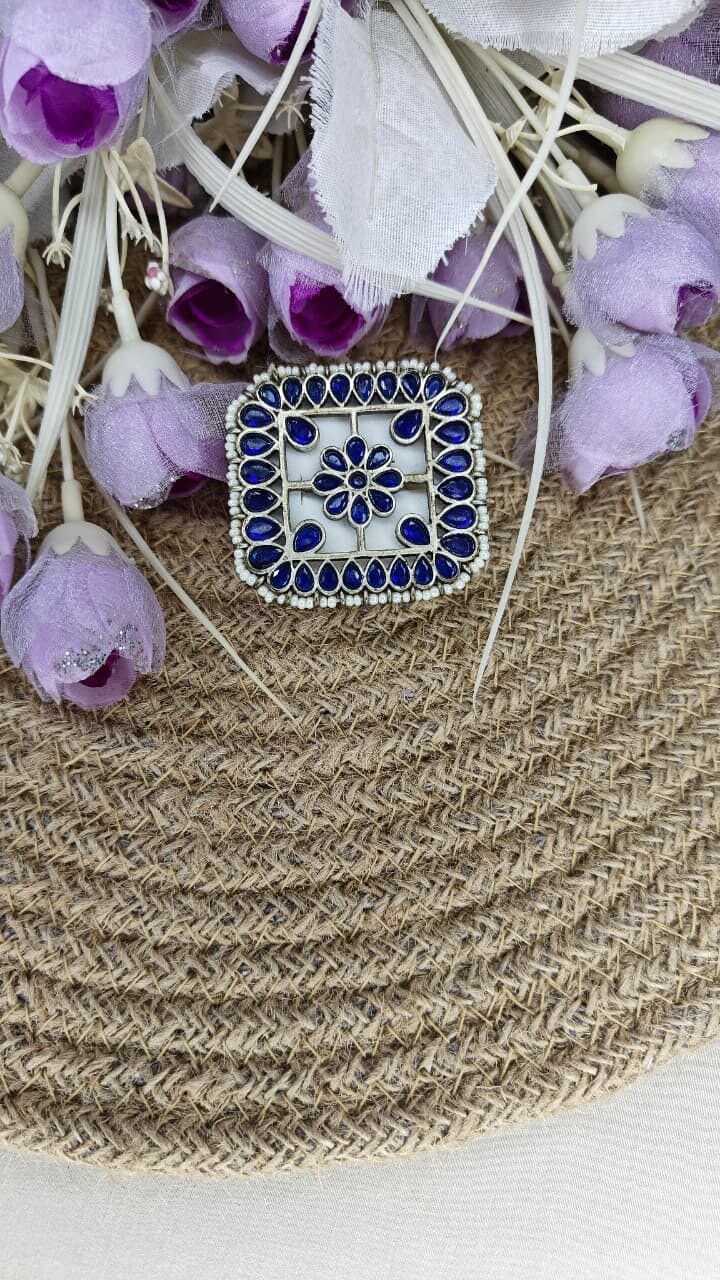 Description: Elegant square ring with blue stones and floral centerpiece, bordered with intricate silver work.