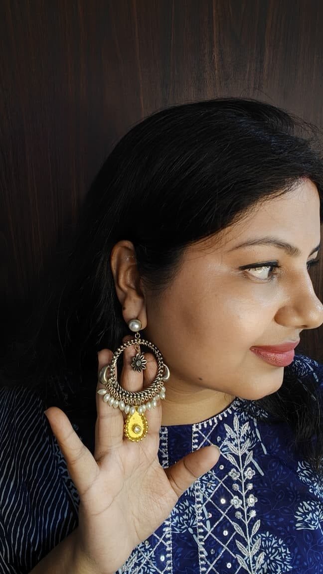 Graceful oxidized silver hoop earrings featuring a central floral charm and crescent moon accents. Embellished with pearl bead fringes and a golden teardrop charm with embossed detailing, these earrings exude an elegant ethnic vibe.