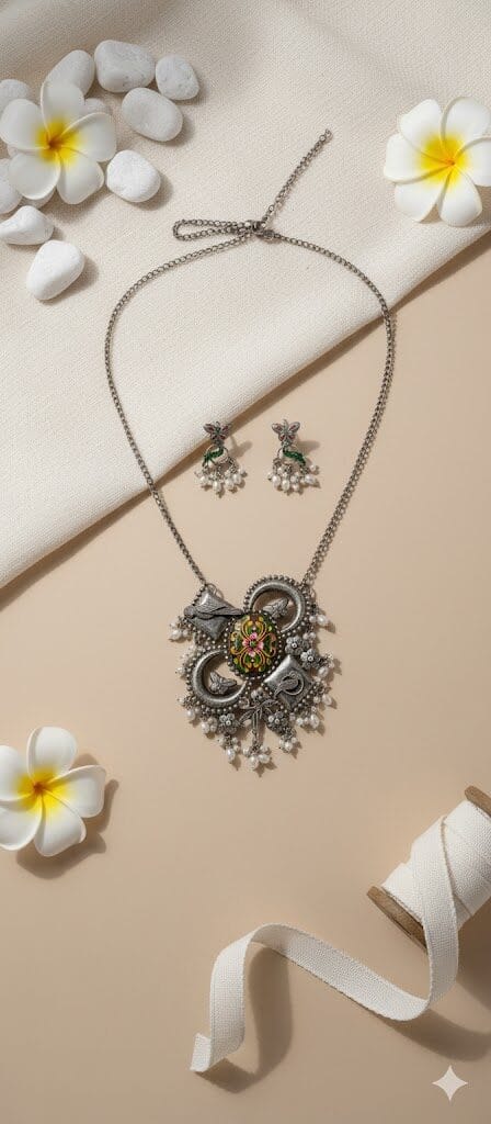 A bold silver replica necklace set inspired by traditional tribal motifs, featuring an ornate central pendant with peacock and floral carvings. Finished with pearl clusters and paired with matching stud earrings, this set adds a striking ethnic statement to any outfit.