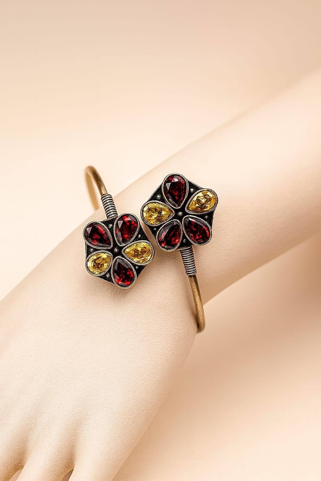 Elegant openable and adjustable brass kada featuring floral motifs adorned with red and yellow teardrop stones, perfect for festive and ethnic wear.