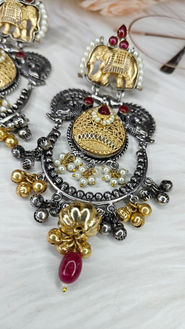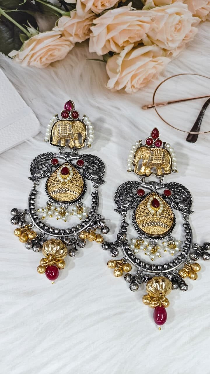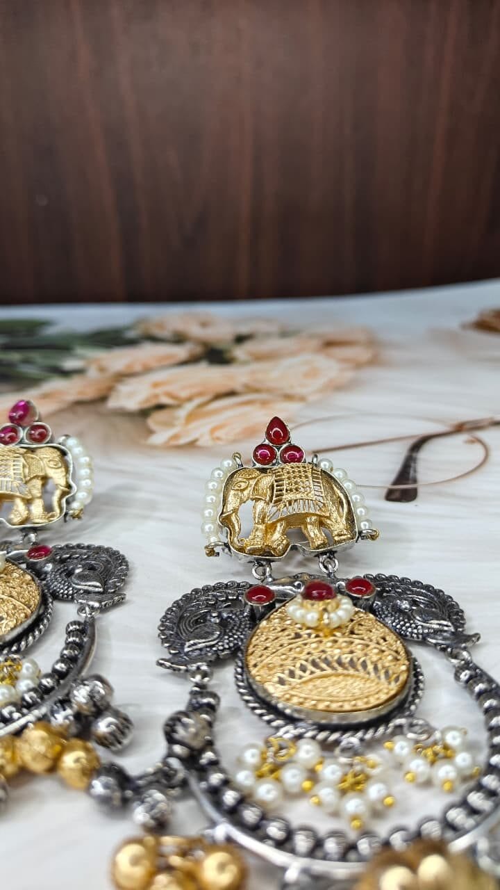 Description: Dual-tone handcrafted danglers with intricate elephant and peacock motifs, red stone accents, and pearl embellishments.