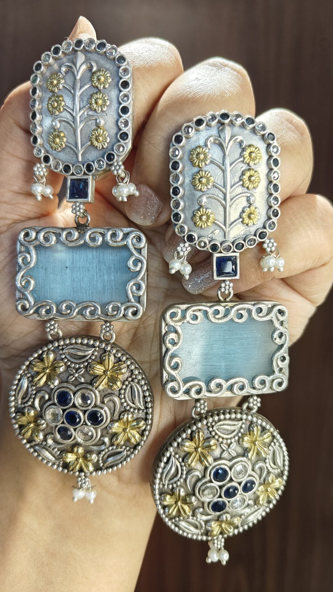 Exquisite dual-tone silver earrings featuring intricate floral embossing with golden polish highlights. Accented with deep blue stone detailing and delicate pearl drops, the design blends rectangle and round elements for a regal, handcrafted look.