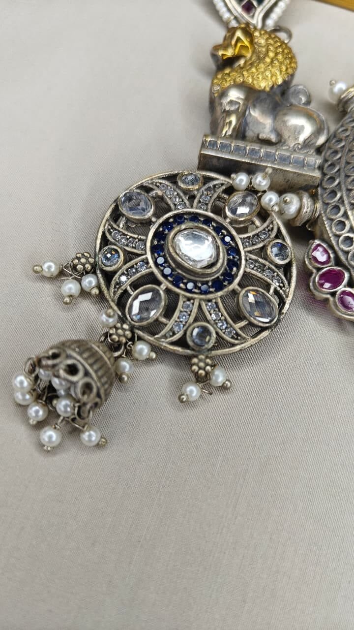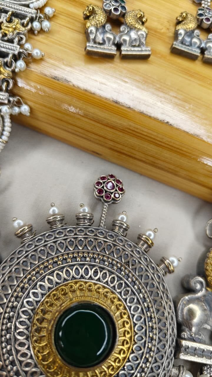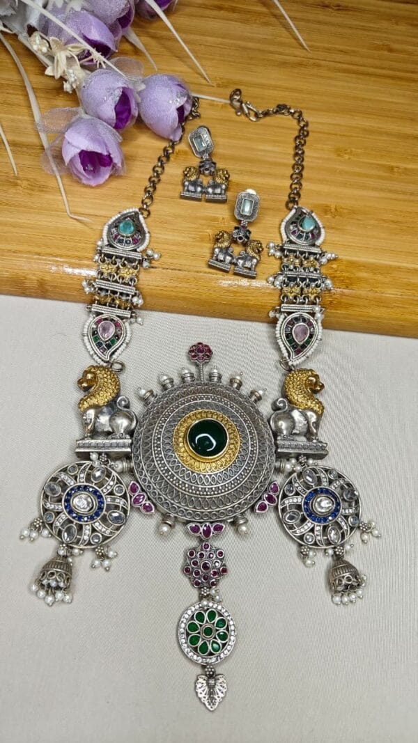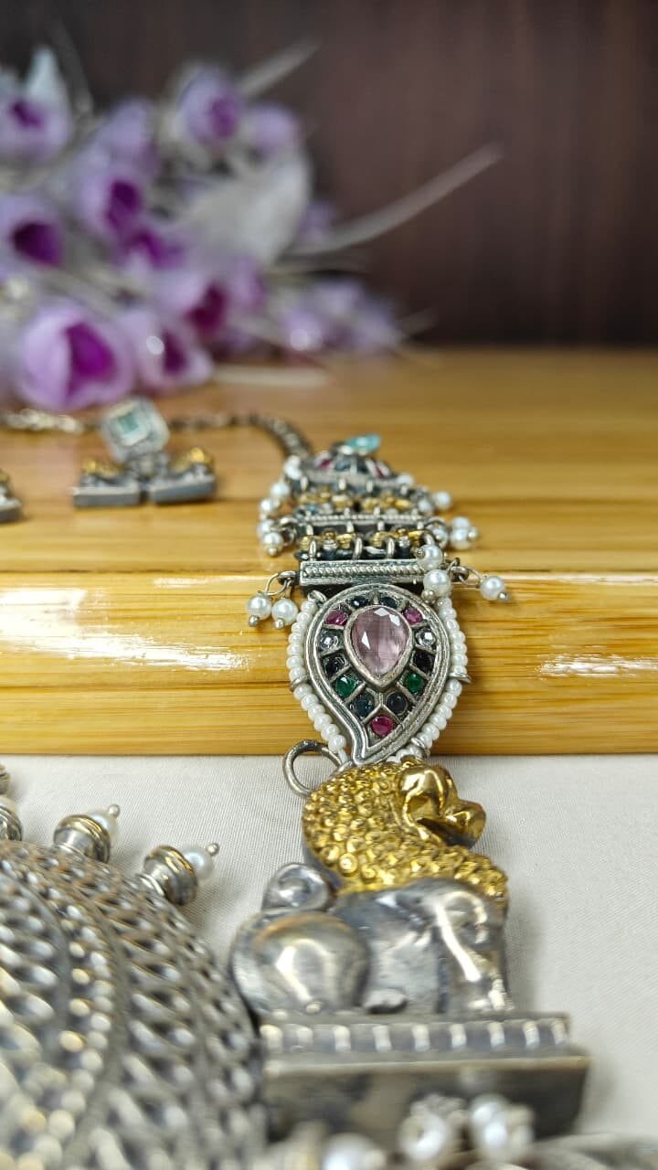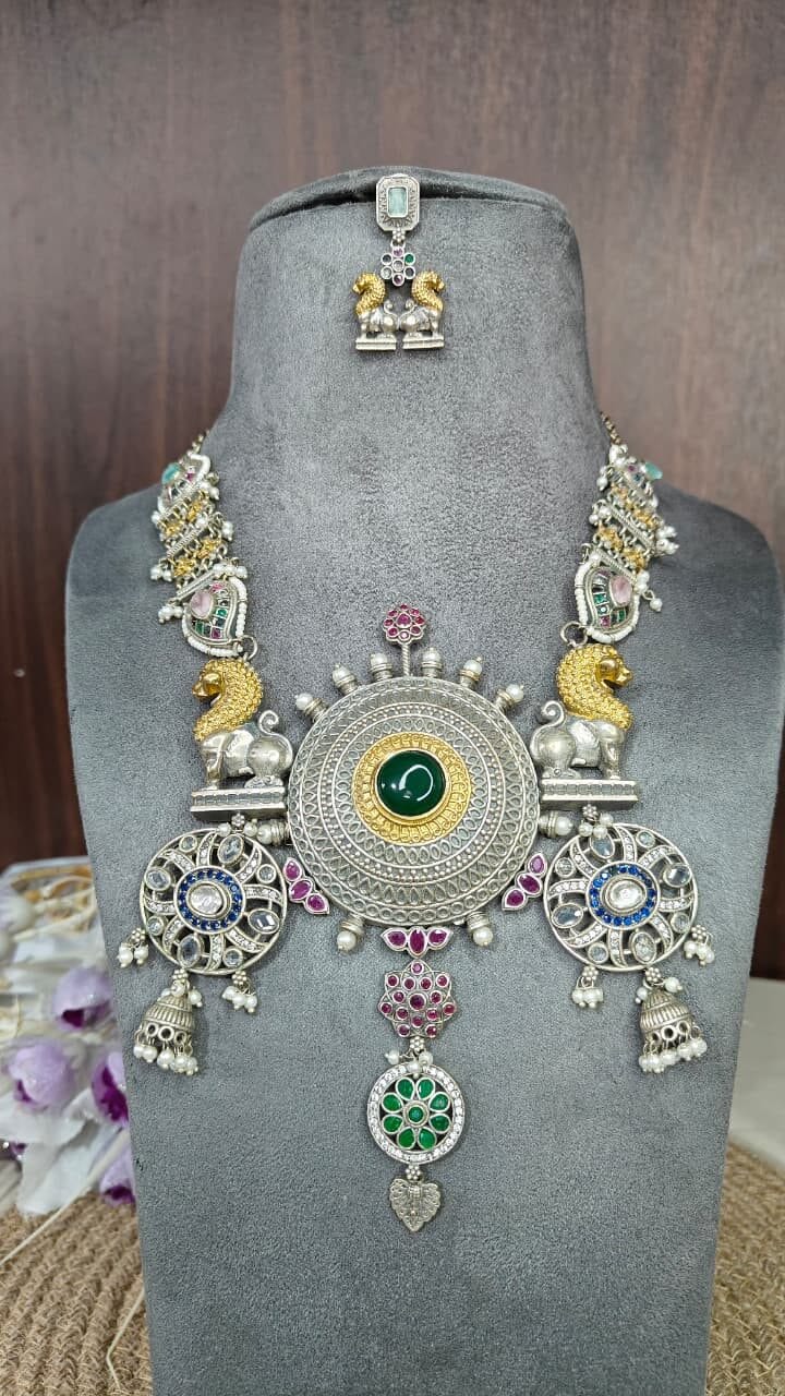 Description: Exquisite traditional Indian statement necklace showcasing royal elegance. Features a magnificent circular centerpiece with deep emerald green stone, flanked by ornate elephant motifs symbolizing prosperity. Multi-tiered design includes geometric patterns, colorful gemstone accents in purple and blue, and delicate pearl drops. The elaborate chain connects decorative crown-like elements, creating a regal silhouette. Perfect for weddings, festivals, and cultural celebrations, this piece embodies traditional craftsmanship with contemporary appeal.