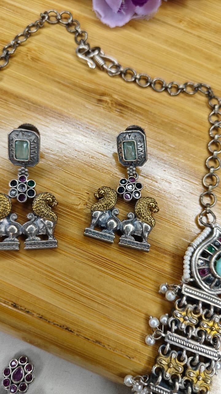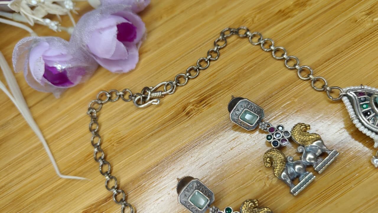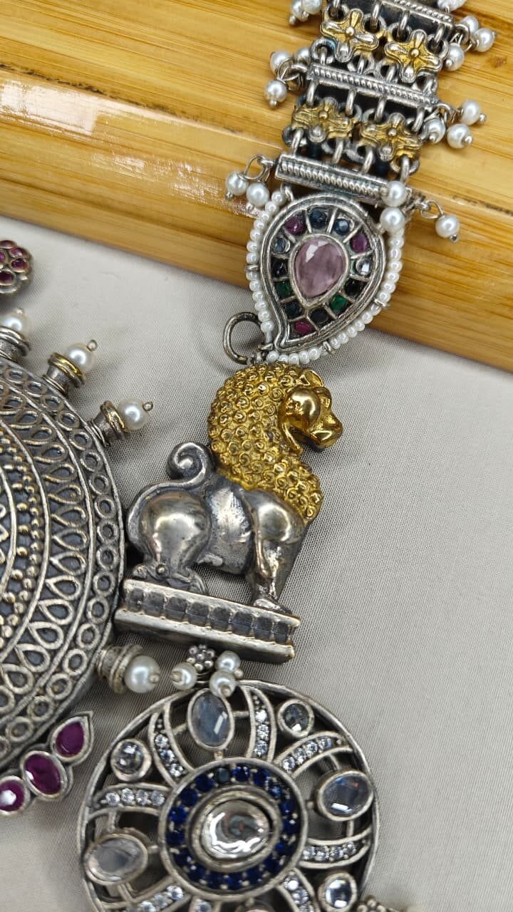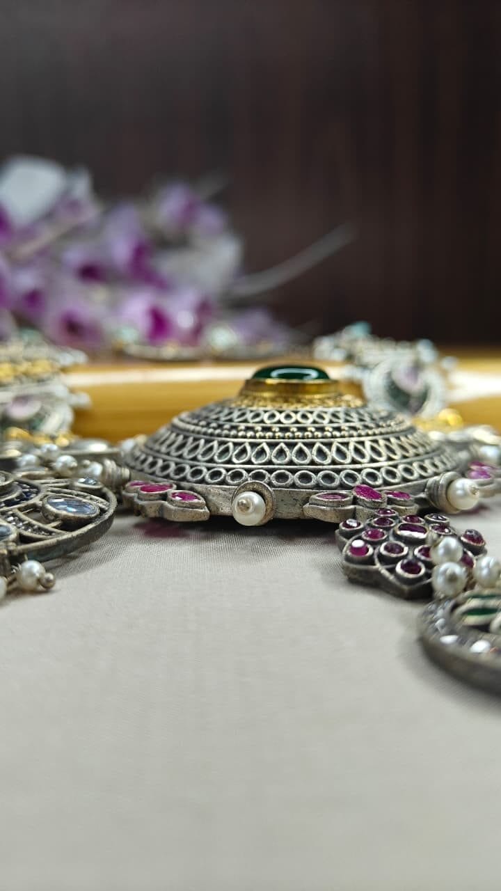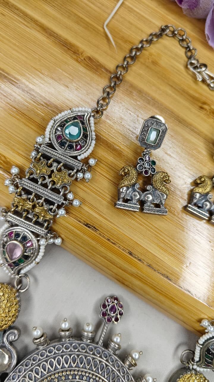 Description: Exquisite traditional Indian statement necklace showcasing royal elegance. Features a magnificent circular centerpiece with deep emerald green stone, flanked by ornate elephant motifs symbolizing prosperity. Multi-tiered design includes geometric patterns, colorful gemstone accents in purple and blue, and delicate pearl drops. The elaborate chain connects decorative crown-like elements, creating a regal silhouette. Perfect for weddings, festivals, and cultural celebrations, this piece embodies traditional craftsmanship with contemporary appeal.