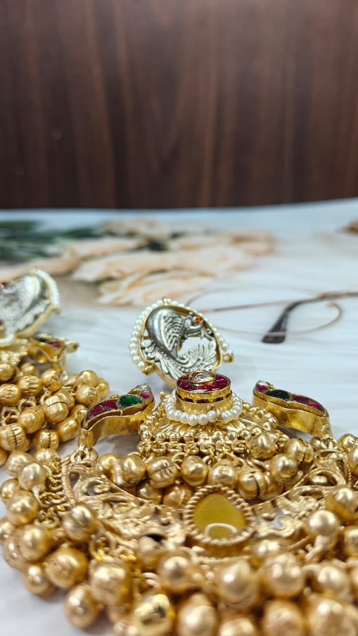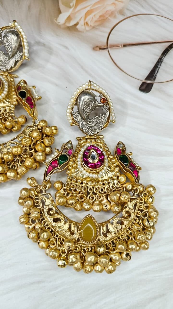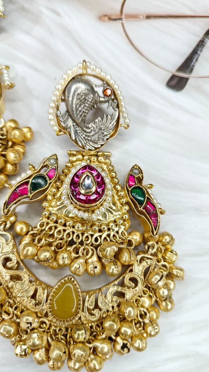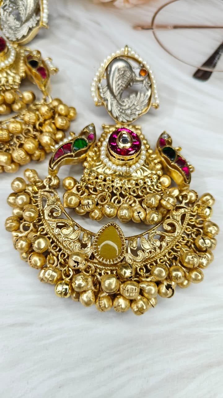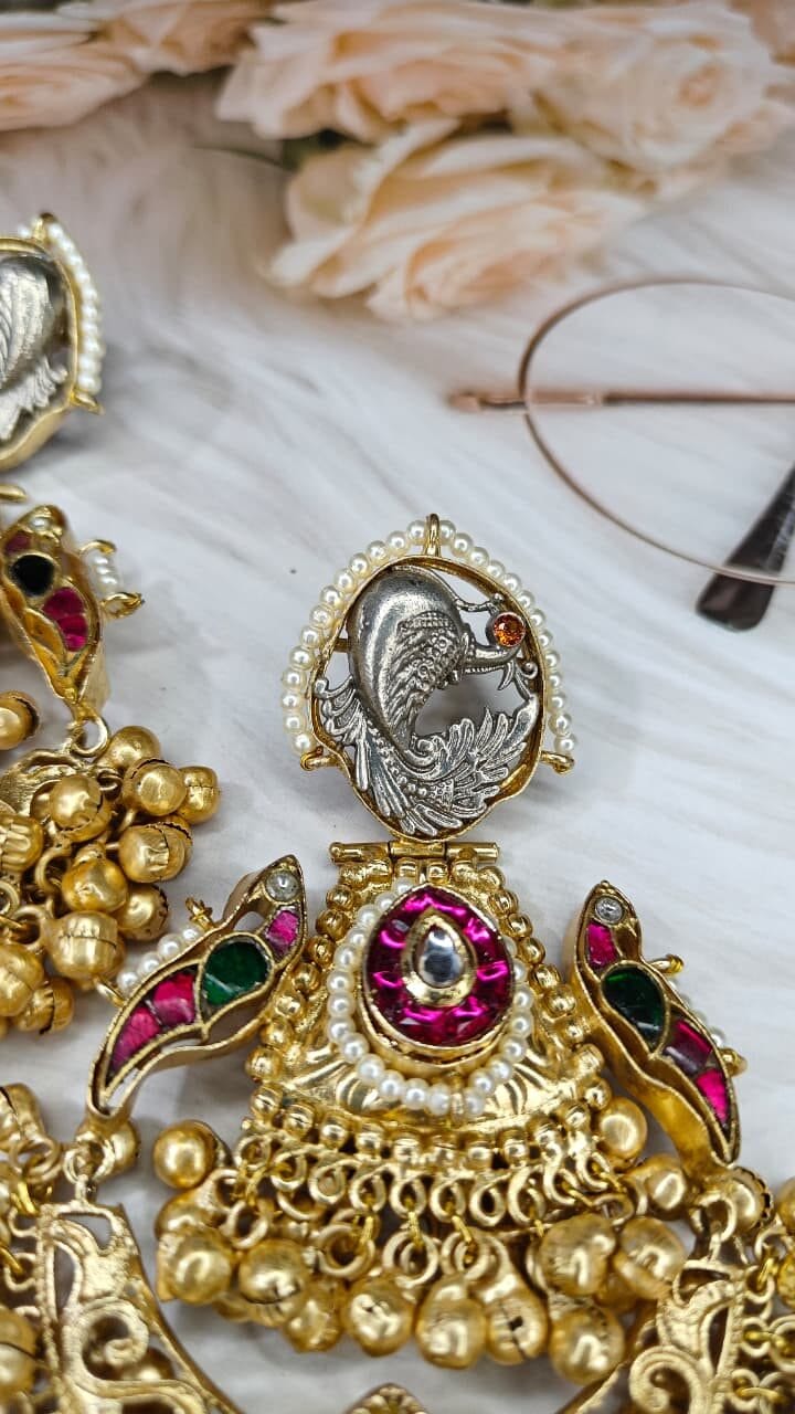 Description: Majestic dual-tone earrings featuring silver peacock tops, ruby-green kundan detailing, intricate filigree, and golden ghungroo accents.