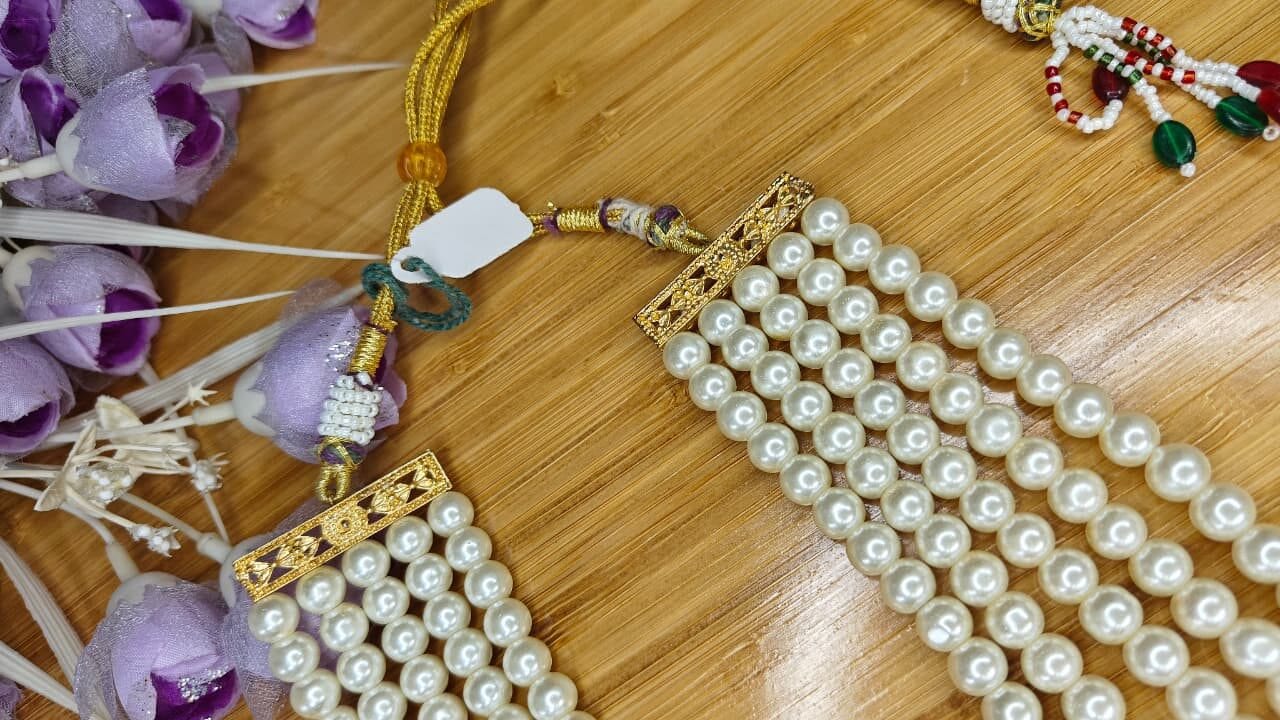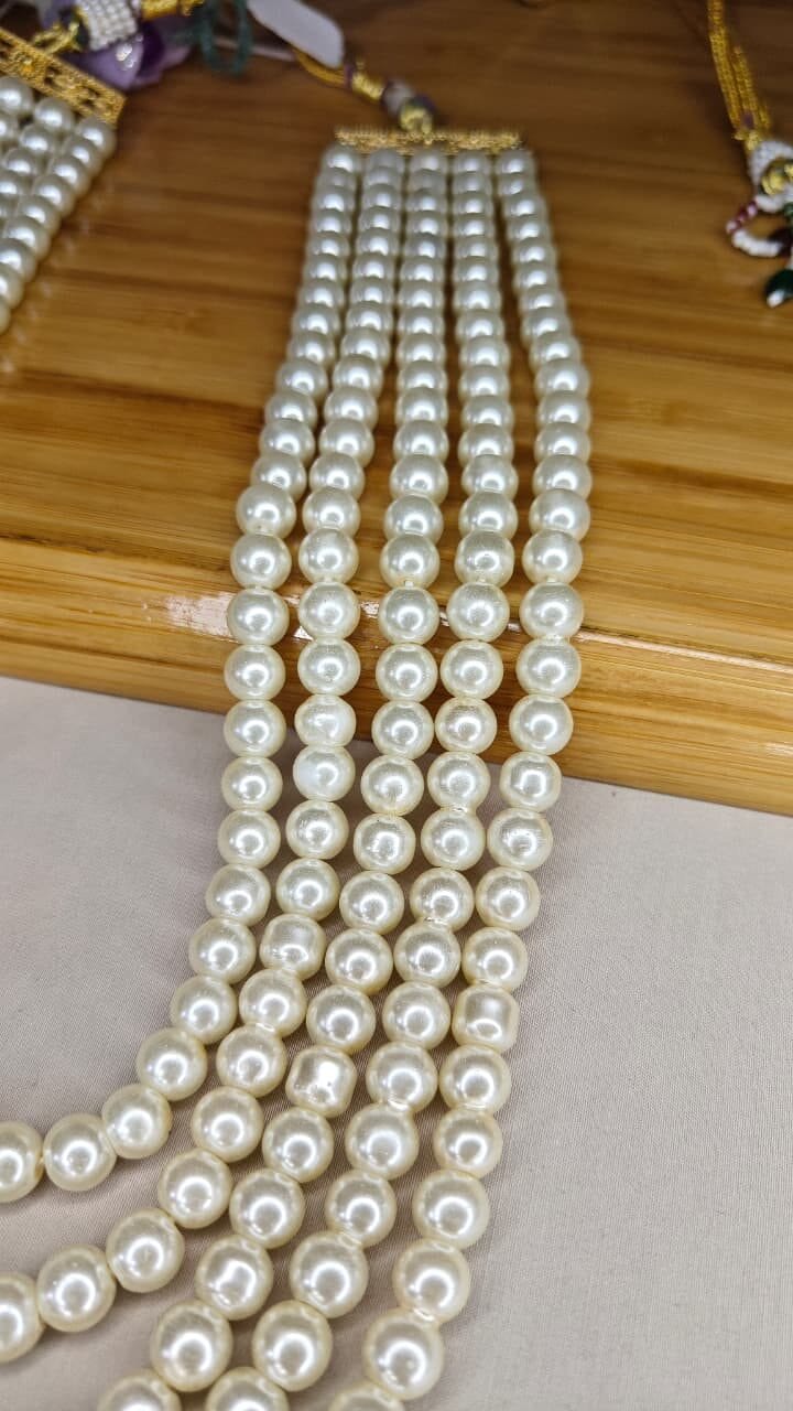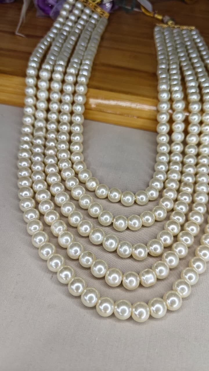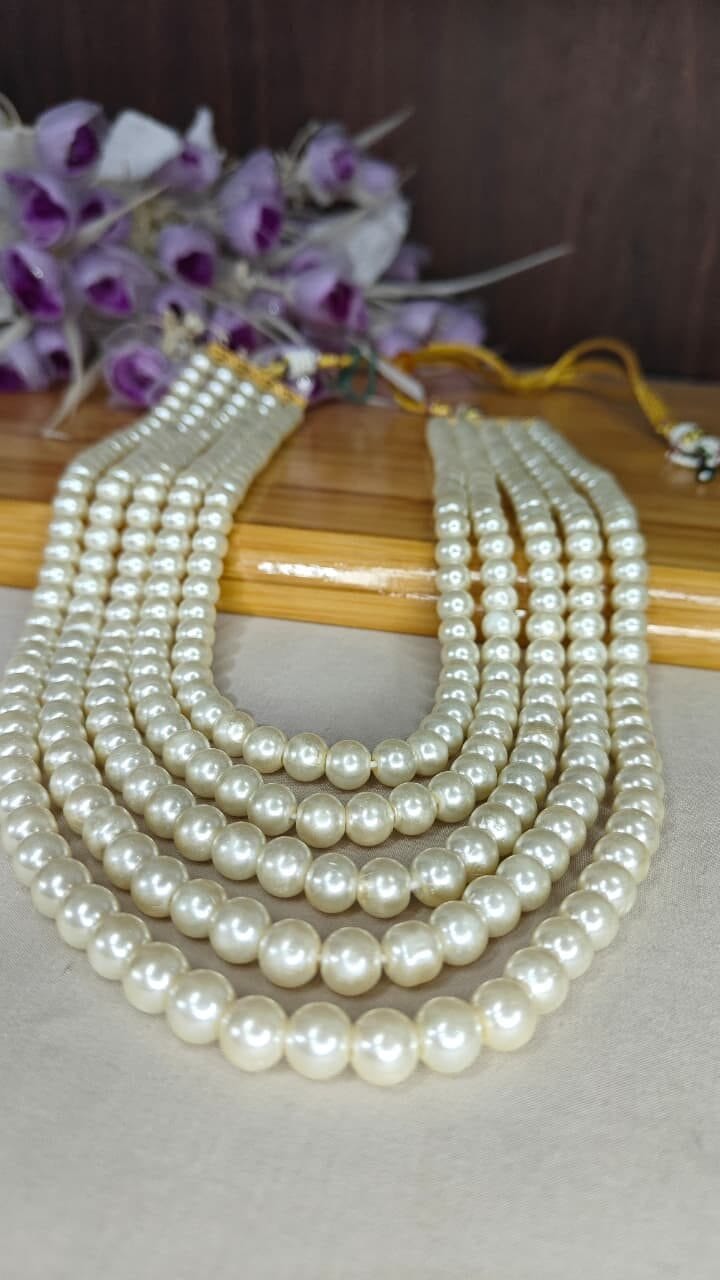 A grand multi-layered pearl necklace designed with regal elegance. The lustrous pearls are arranged in six layers, making it a timeless piece for weddings and festive occasions. Inspired by traditional royal jewelry, this haar adds sophistication and grace to any ethnic attire.