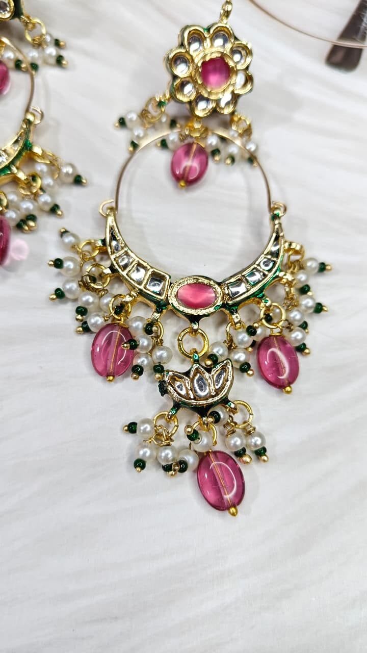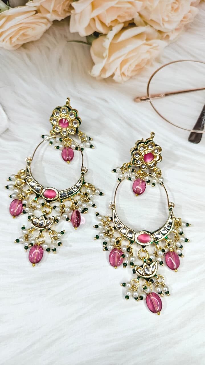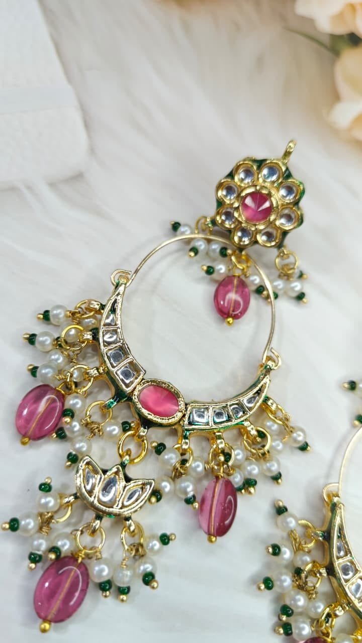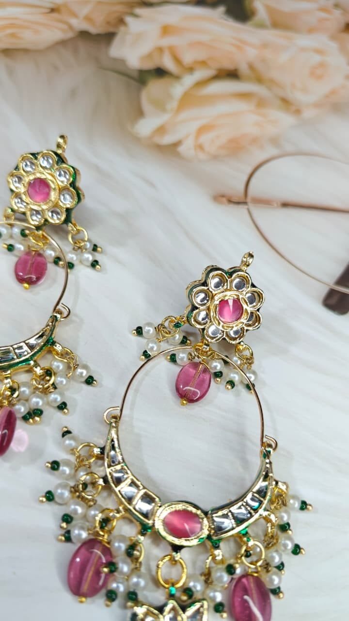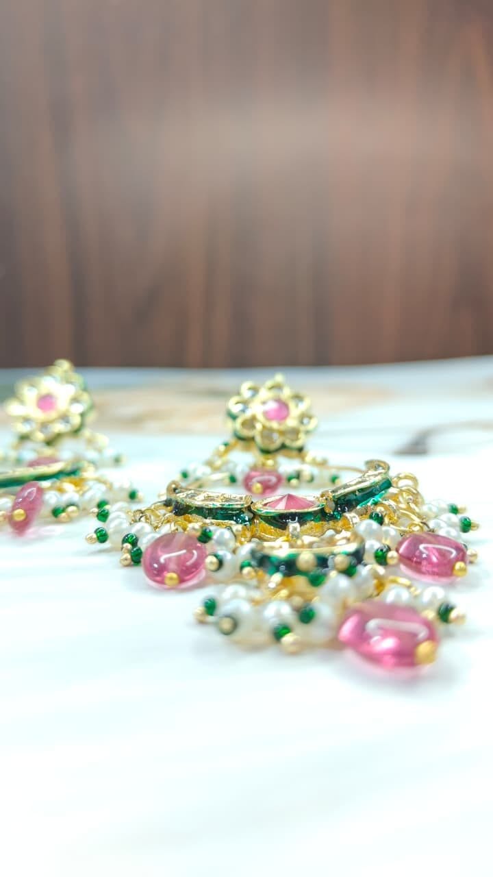 Graceful chandbali earrings with soft pink stones and green enamel accents