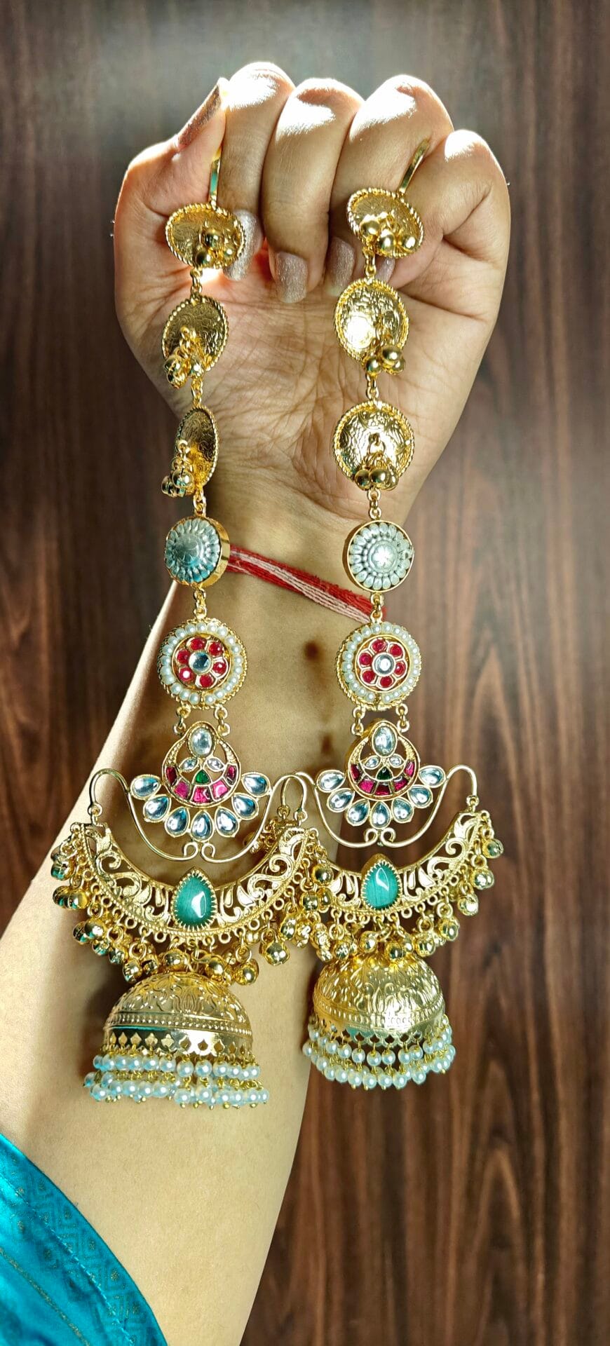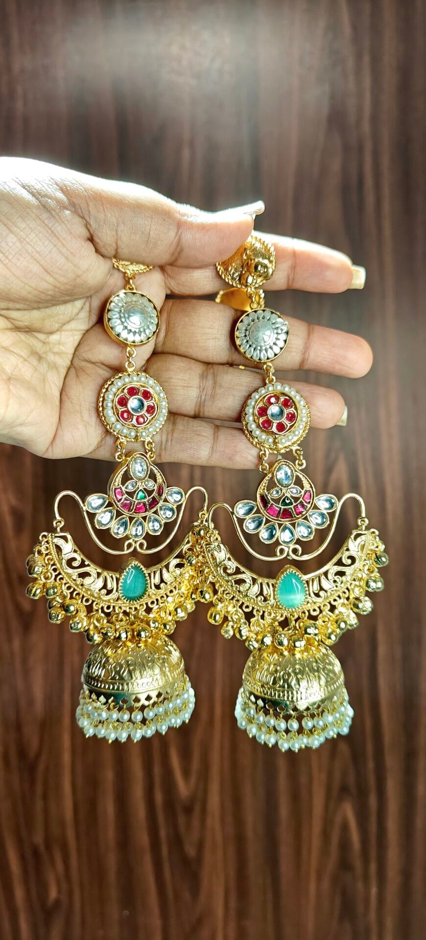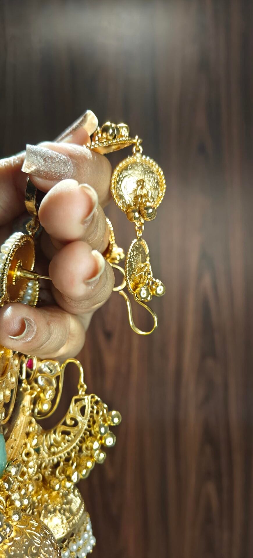 Description: Exquisite long jhumkas featuring handcrafted motifs, pastel green stones, and delicate pearls. The cascading coin design adds a regal rhythm, perfect for elevating festive or bridal looks.