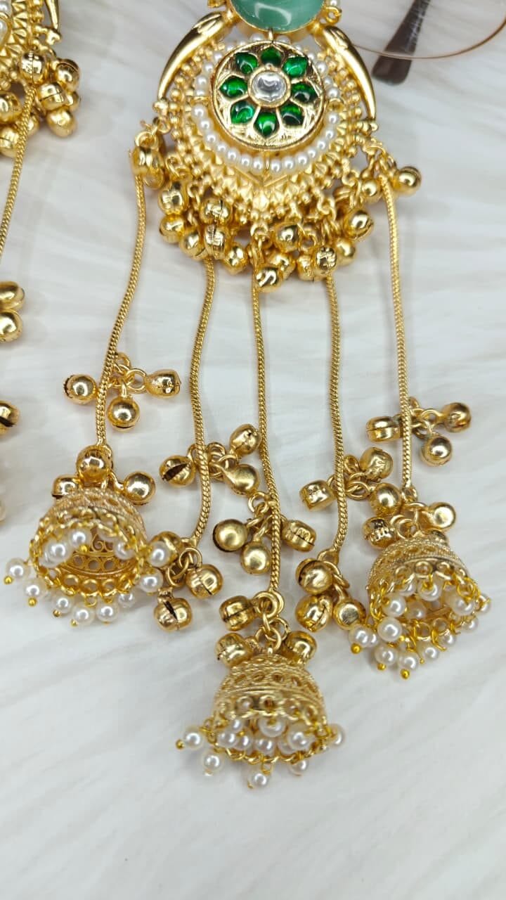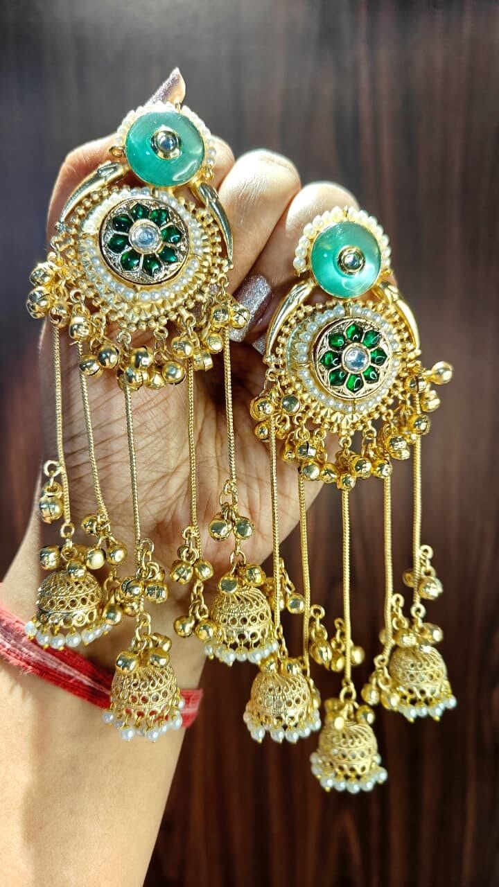 Multiple fine golden chains ending in miniature filigree jhumkas