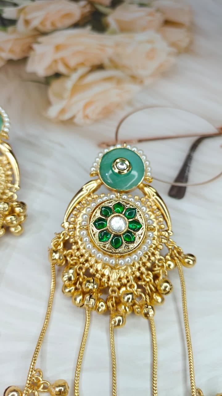 Floral arrangement of emerald-green stones encircling a brilliant kundan centerpiece