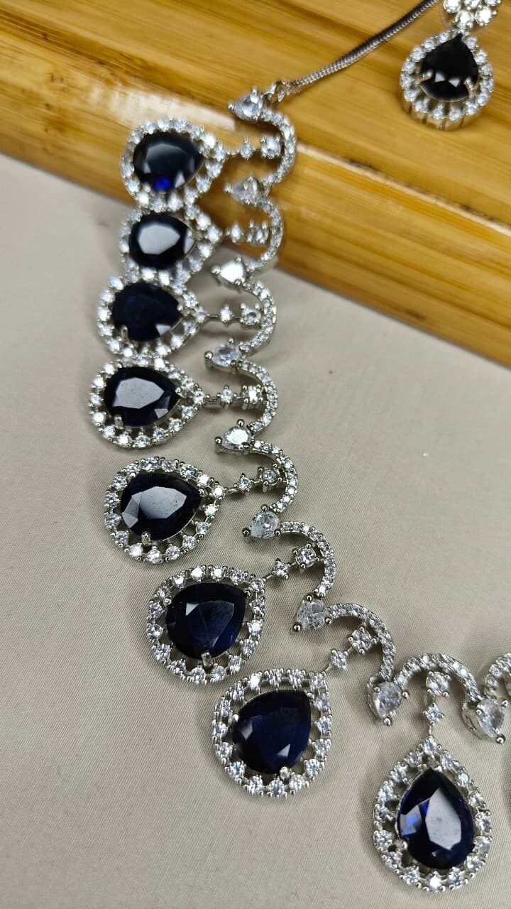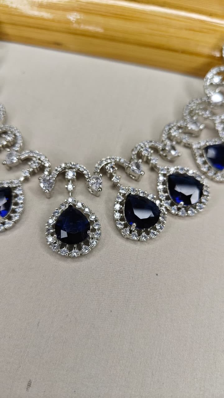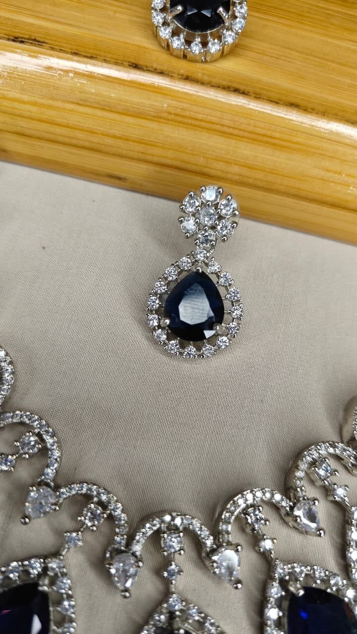 Description: Luxurious contemporary jewelry set featuring stunning deep sapphire blue stones in elegant teardrop and oval cuts. The necklace showcases an intricate swirl design with cascading blue crystals surrounded by sparkling clear rhinestones, creating a dramatic collar effect. Matching drop earrings complete the sophisticated look. High-quality crystal work mimics precious gemstones with brilliant faceting and exceptional clarity. Perfect for evening events, cocktail parties, or special occasions requiring glamorous accessories.