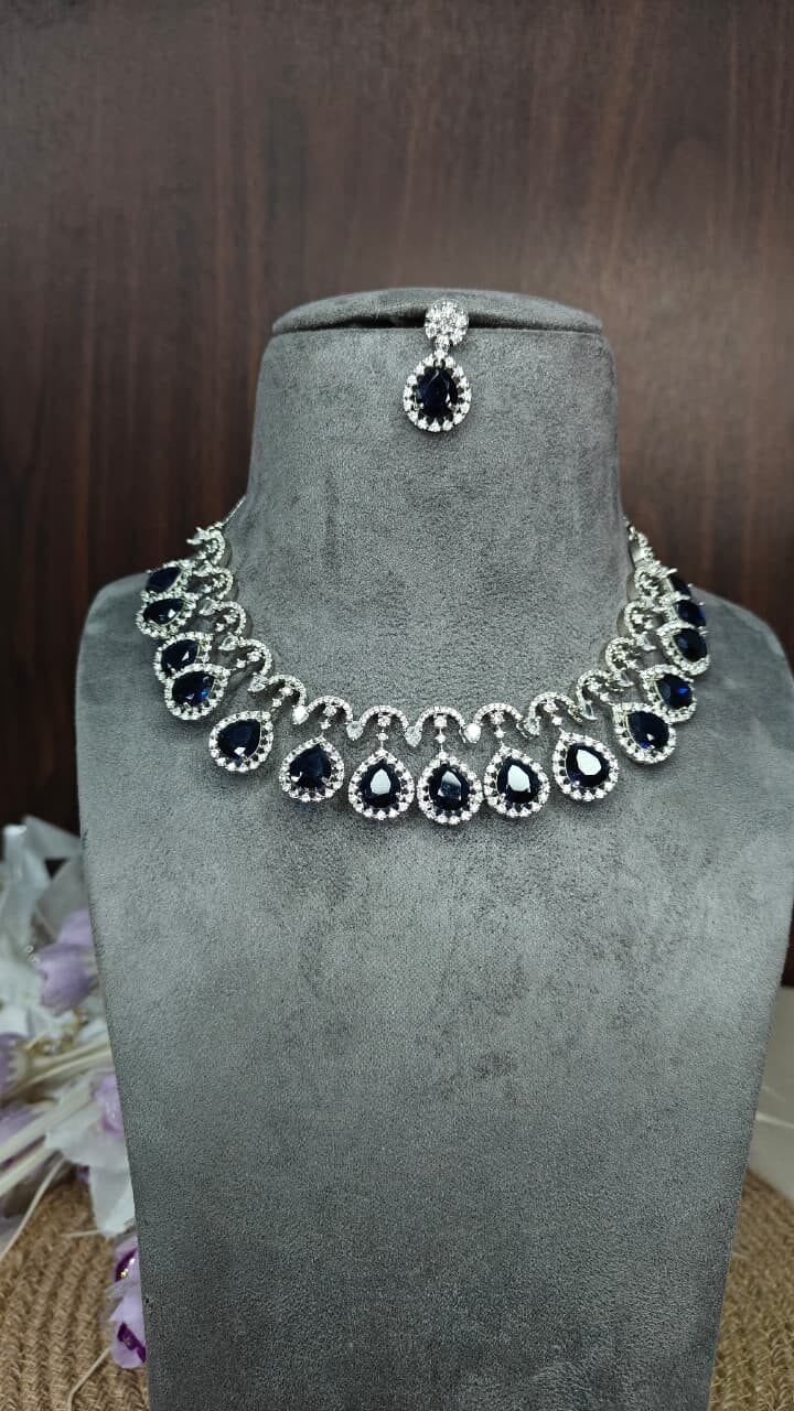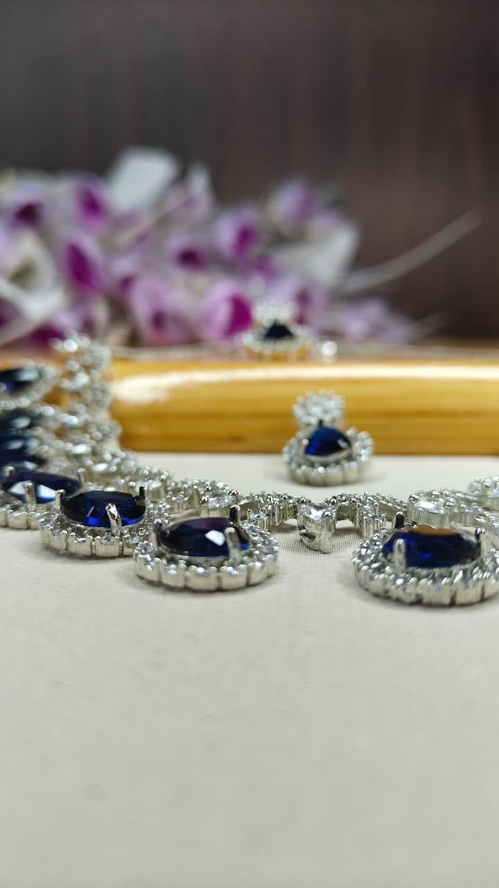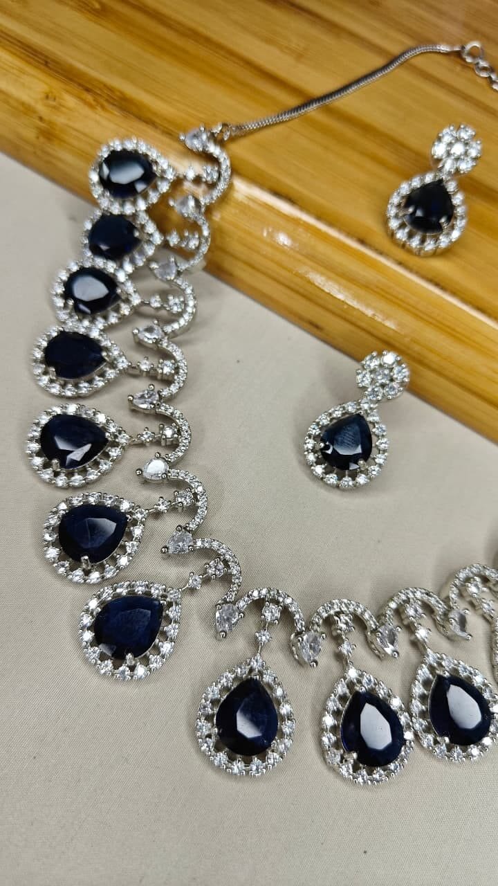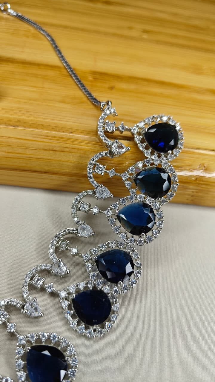Description: Luxurious contemporary jewelry set featuring stunning deep sapphire blue stones in elegant teardrop and oval cuts. The necklace showcases an intricate swirl design with cascading blue crystals surrounded by sparkling clear rhinestones, creating a dramatic collar effect. Matching drop earrings complete the sophisticated look. High-quality crystal work mimics precious gemstones with brilliant faceting and exceptional clarity. Perfect for evening events, cocktail parties, or special occasions requiring glamorous accessories.