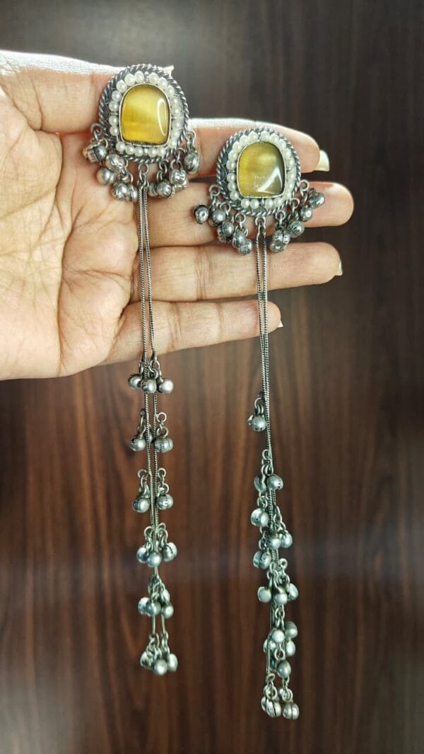 Sufi Kashmiri Earrings featuring a golden-yellow stone framed in oxidized silver with cascading danglers, perfect for bright festive looks.