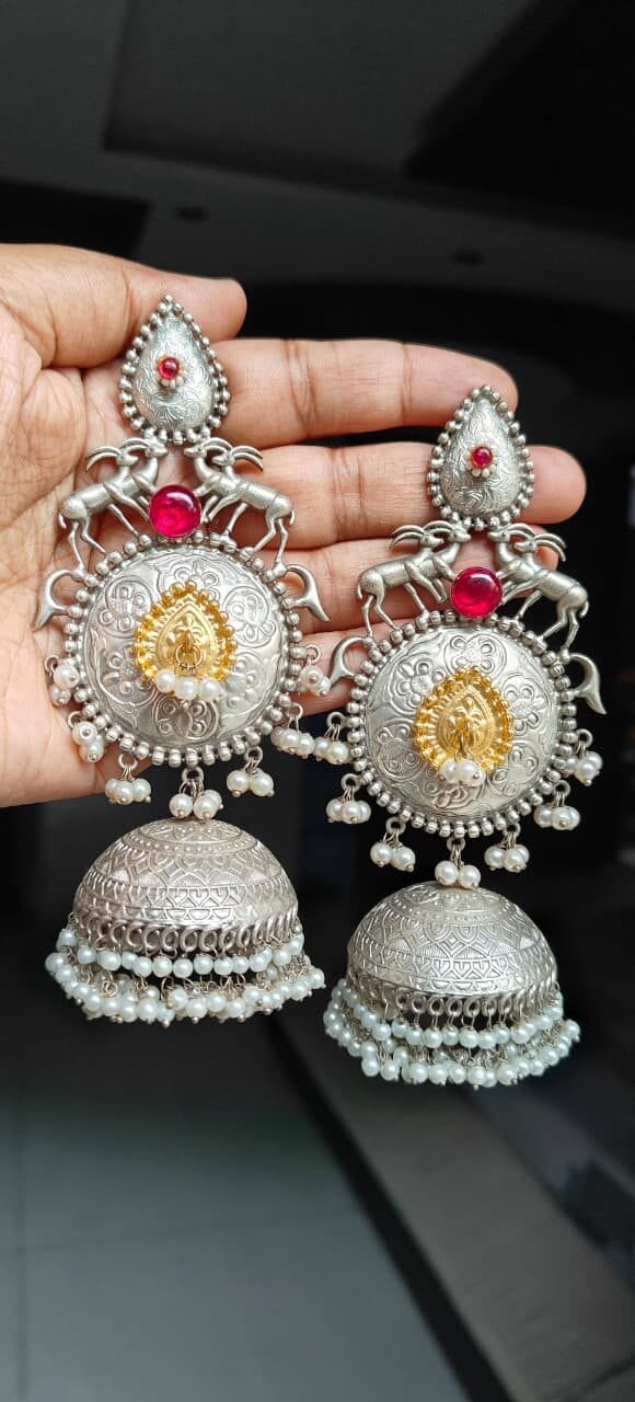 A regal pair of antique silver-tone jhumkas with intricate embossing and temple-inspired motifs. The top features a teardrop frame with a ruby-red stone, leading to a pair of delicately crafted deer figures and a central embossed disc with a golden deity motif. The large dome-shaped jhumkas are bordered with small pearl clusters, creating a rich, traditional finish.