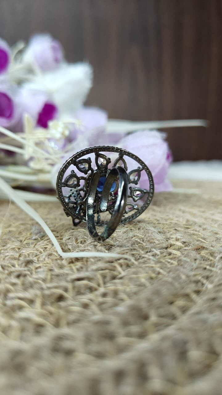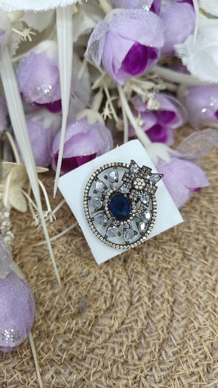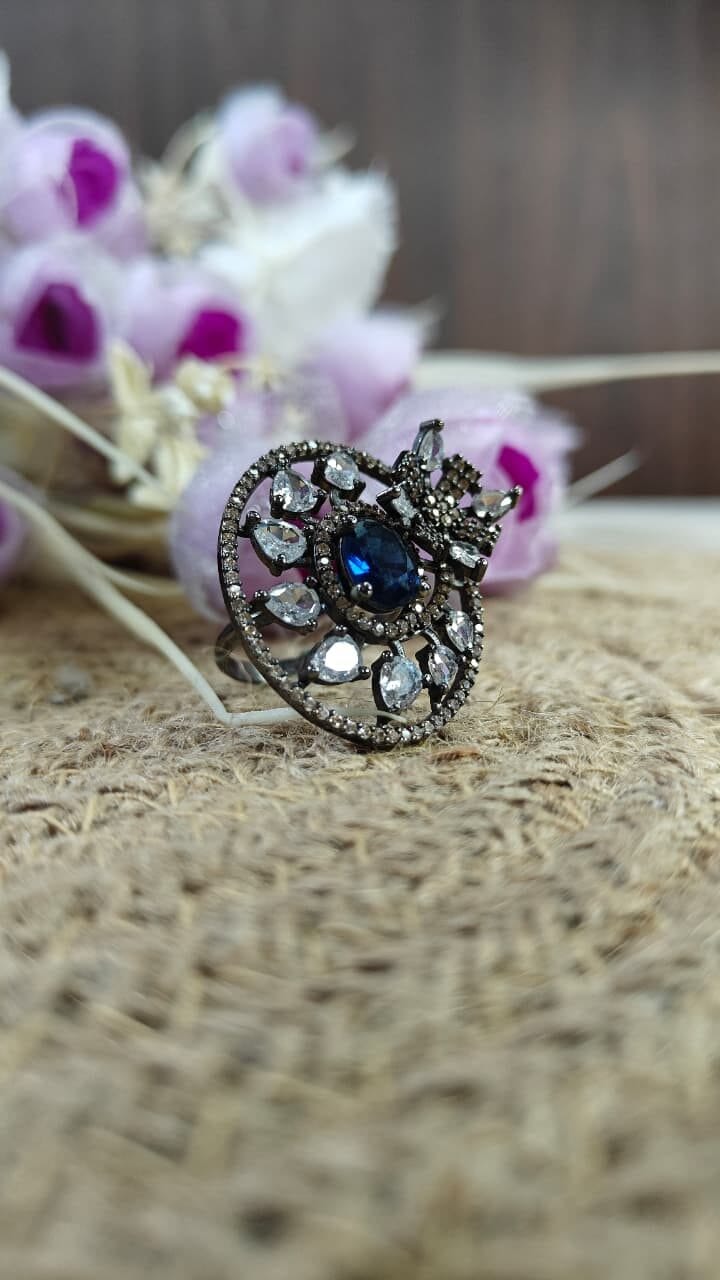 Description: Vintage-inspired statement ring with blue sapphire center and crystal starburst design in antique silver finish.
