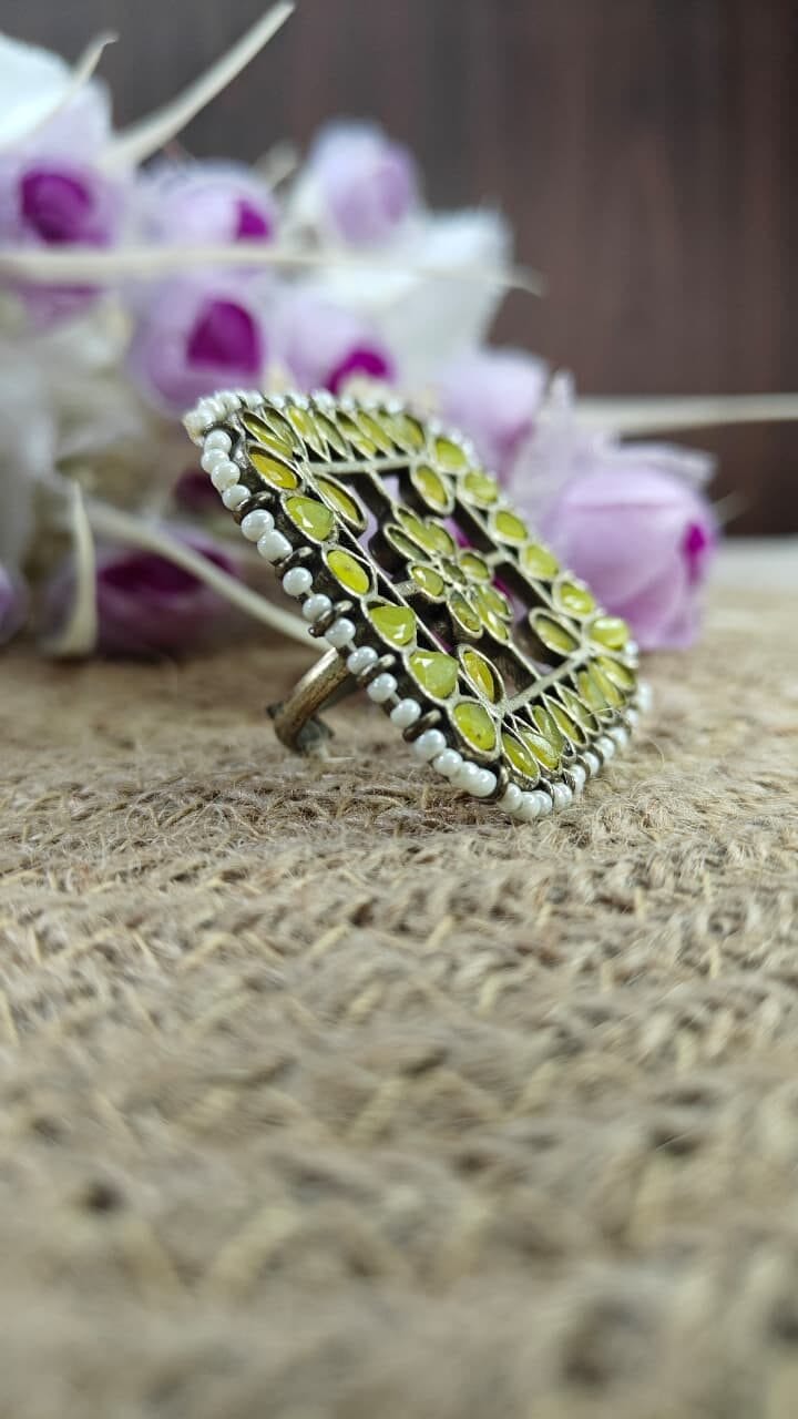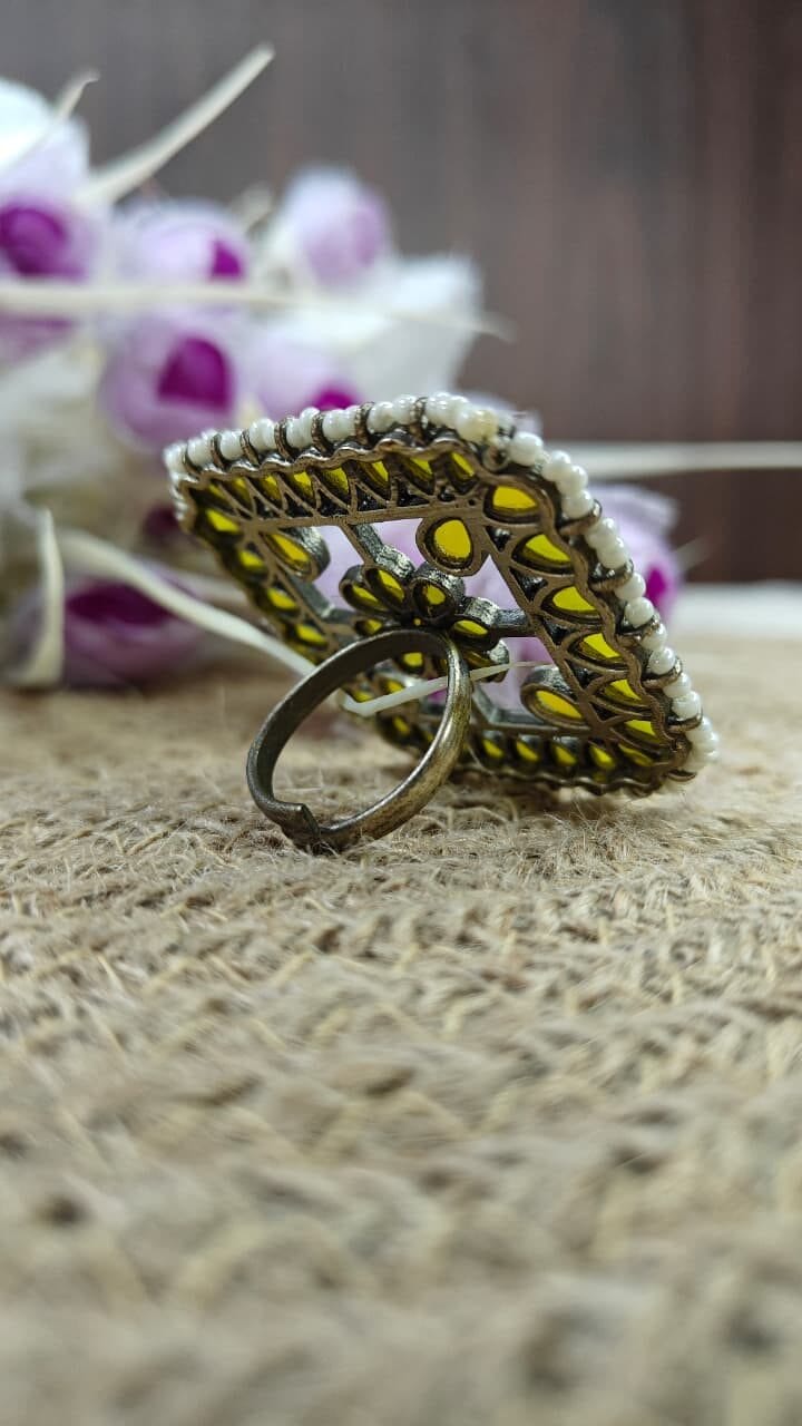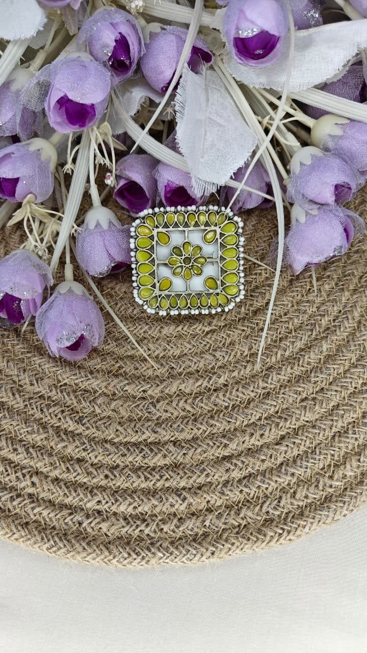 Description: Stylish square ring with vibrant yellow stones and central floral pattern, framed with detailed silver.