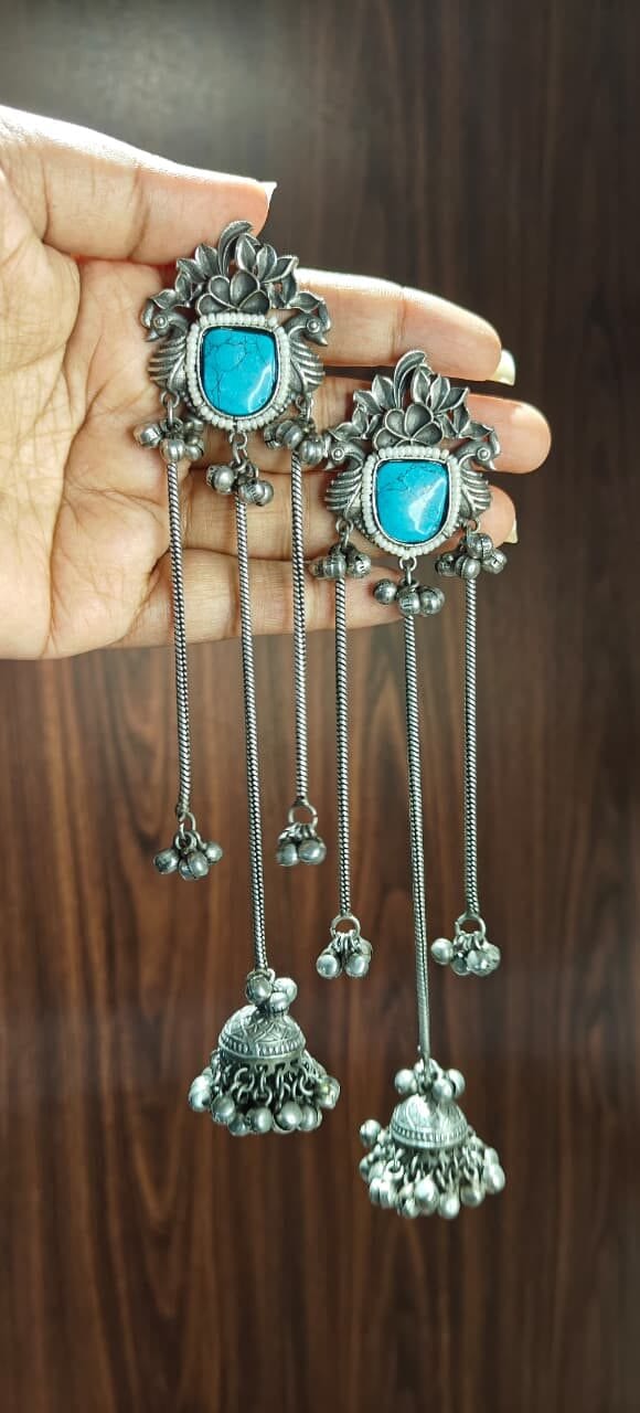 Gorgeous oxidized Kashmiri earrings with striking turquoise stones, floral motifs, and long jhumka chains, adding a bold and traditional charm to your ethnic look.