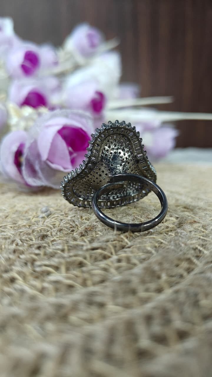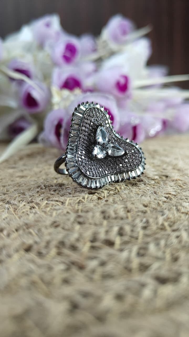 The Zyra Ring is a statement piece crafted with brilliance and elegance. Designed in a unique triangular form, it is adorned with high-quality CZ stones that sparkle with unmatched radiance. At its center, three pear-cut CZ stones form a delicate floral motif, surrounded by micro-set CZs for added shimmer. The outer border features baguette-cut CZ accents, enhancing its luxurious charm. Perfect for cocktail evenings, festive wear, or statement styling.